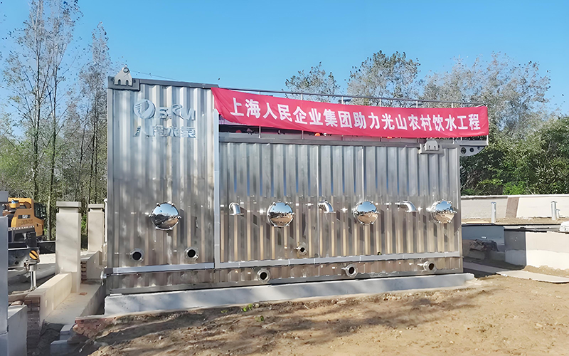Our company dispatched engineers to survey the raw water conditions in Guangshan County and conduct cost analysis. It was found that the local river water had high sediment and algae content, with strong periodic fluctuations. To address this, we adopted a water treatment process consisting of coagulation, flocculation, sedimentation, filtration, and disinfection. The integrated design, made entirely of SUS304 stainless steel, operates fully automatically, ensuring that the treated water meets the national GB5749-2006 Sanitary Standard for Drinking Water.